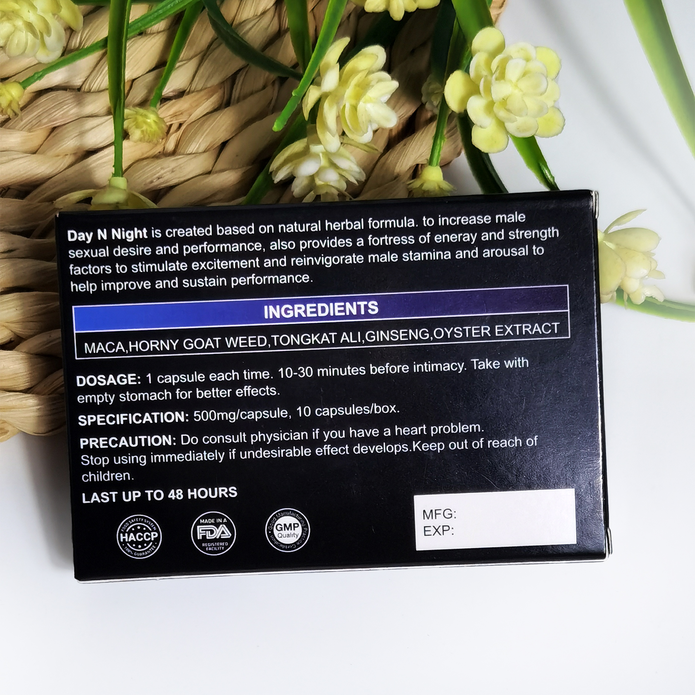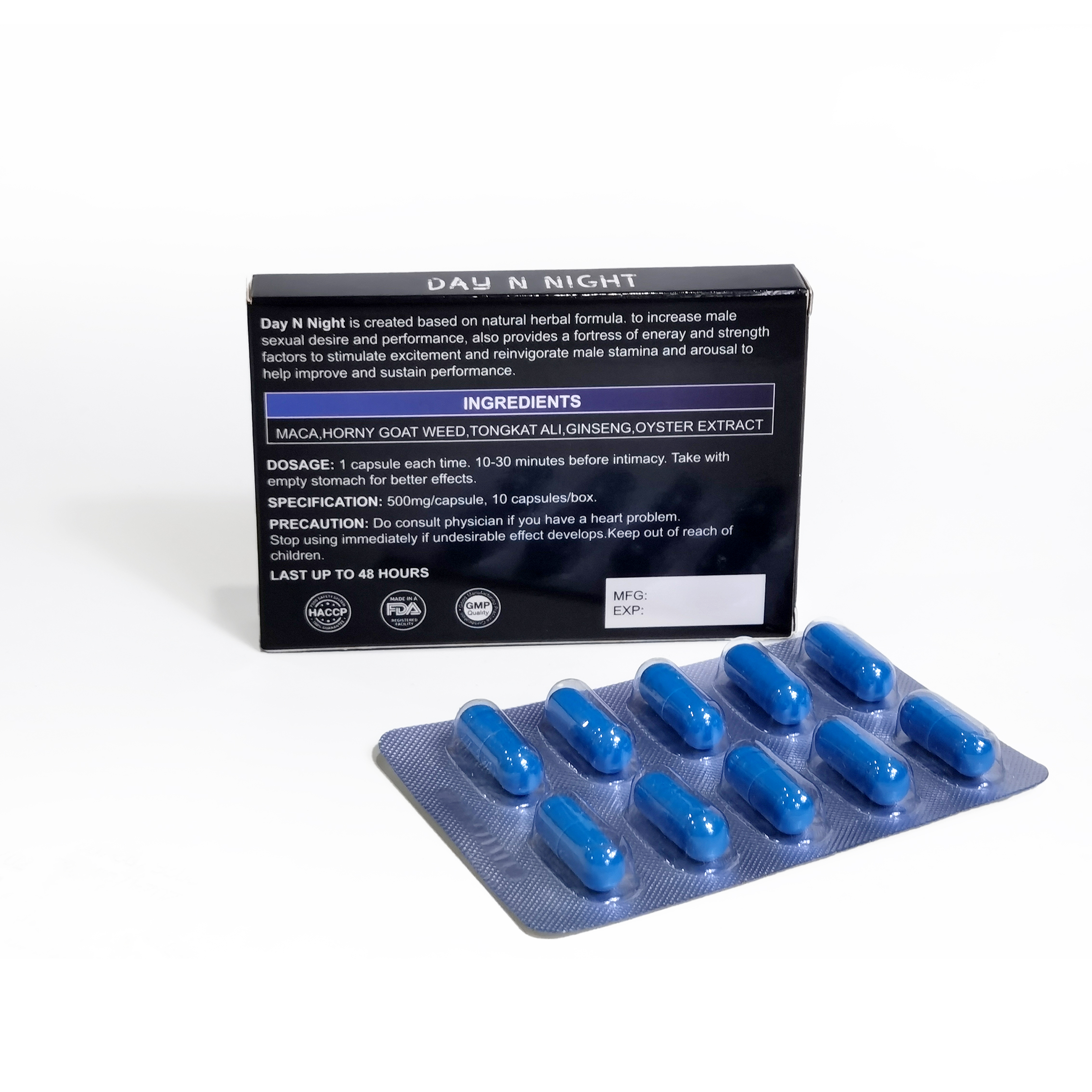 1.30 minutes to 1 hour, quick erection. 2. Male impotence and prospermia. 3. Maintaining male endocrine balance and delaying senility. 4 .Strengthening the function of immunity to promote blood circulation. 5. Enhancing physical ability and vigor. |
